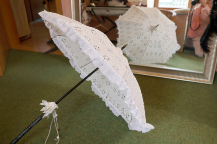 Schirme nach historischem Vorlagen. Der kaputte Stoff wird abgezogen, die Mechanik gereinigt und gefügig gemacht, die neue Bespannung genäht und verziert. Dabei versuche ich so nah am Vorbild zu bleiben wie möglich.