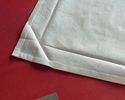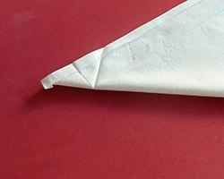 ![]() | Den Saum aufklappen und die Ecke rechtwinklig einschlagen. Die Bügelfalten liegen aufeinander. |